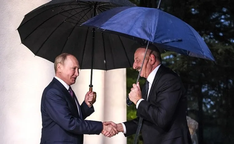 Президент Азербайджана Ильхам Алиев (справа) приехал на встречу с российским лидером со своим зонтиком