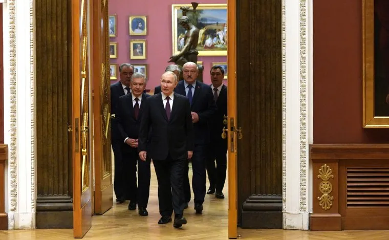 Этим утром президент Путин лично начал экскурсию для своих коллег Александра Лукашенко (Белоруссия), Касыма-Жомарта Токаева (Казахстан), Садыра Жапарова (Киргизия), Эмомали Рахмона (Таджикистан), Шавката Мирзиеева (Узбекистан). С небольшим опозданием к ним присоединился и премьер-министр Армении Никол Пашинян. В Михайловском дворце лидеры побывали в большом танцевальном, или Академическом, зале, в парадной столовой, где представлены работы художников Карла Брюллова, Ивана Айвазовского, Федора Бруни.