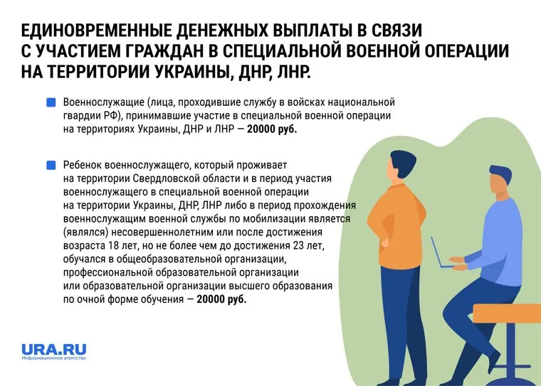 - Ребенок военнослужащего, который проживает на территории Свердловской области и в период участия военнослужащего в специальной военной операции на территории Украины, Донецкой Народной Республики, Луганской Народной Республики либо в период прохождения военнослужащим военной службы по мобилизации является (являлся) несовершеннолетним или после достижения возраста 18 лет, но не более чем до достижения 23 лет, обучался в общеобразовательной организации, профессиональной образовательной организации или образовательной организации высшего образования по очной форме обучения — 20000 руб.