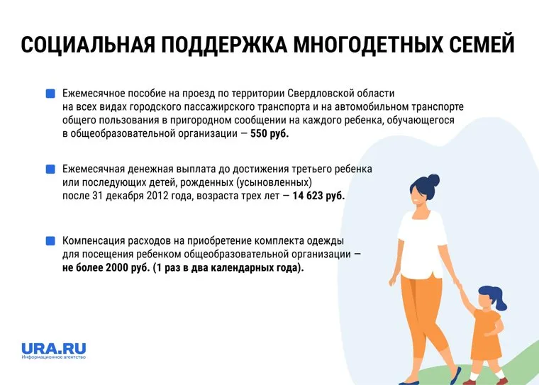 - Ежемесячное пособие на проезд по территории Свердловской области на всех видах городского пассажирского транспорта и на автомобильном транспорте общего пользования в пригородном сообщении на каждого ребенка, обучающегося в общеобразовательной организации — 550 руб;