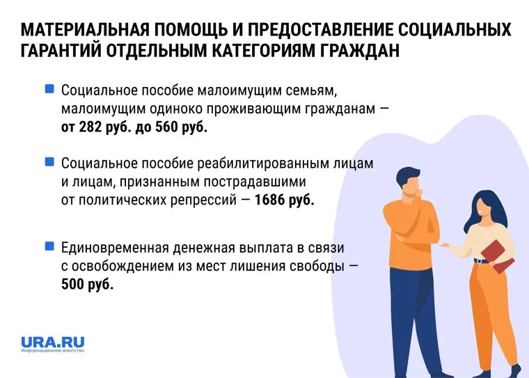 - Социальное пособие малоимущим семьям, малоимущим одиноко проживающим гражданам — от 282 руб. до 560 руб;