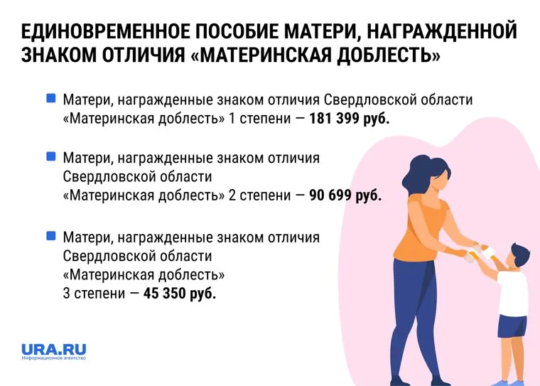 - Матери, награжденные знаком отличия Свердловской области «Материнская доблесть» 3 степени — 45 350 руб.
