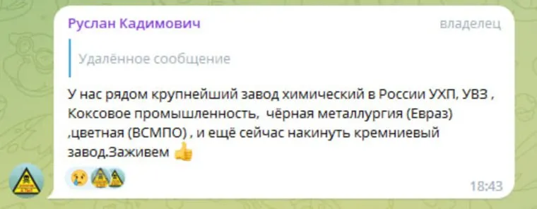 «У нас рядом крупнейший химический завод в России „Уралхимпласт“. „Уралвагонзавод“, коксовая промышленность, черная металлургия (ЕВРАЗ), цветная (ВСМПО). И еще сейчас накинуть кремниевый завод. Заживем!» — пишет владелец чата Руслан Шаймарданов.
