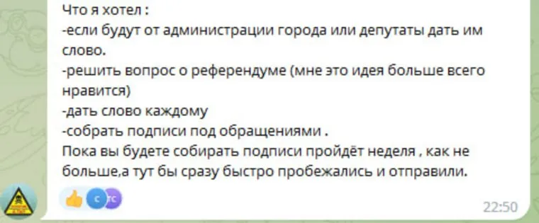 Развитие в чате за несколько дней получила и стратегия протеста — к теме «гуляния» в городском парке группы активистов инициировали сбор подписей за проведение референдума о запрете строительства по выпуску технического кремния. «[Собрание для того], чтобы обсудить вопрос о референдуме и собрать подписи. Времени мало, поэтому за час можно будет собрать то количество которое нам надо, а не бегать за каждым жителем», — пишет Шаймарданов.