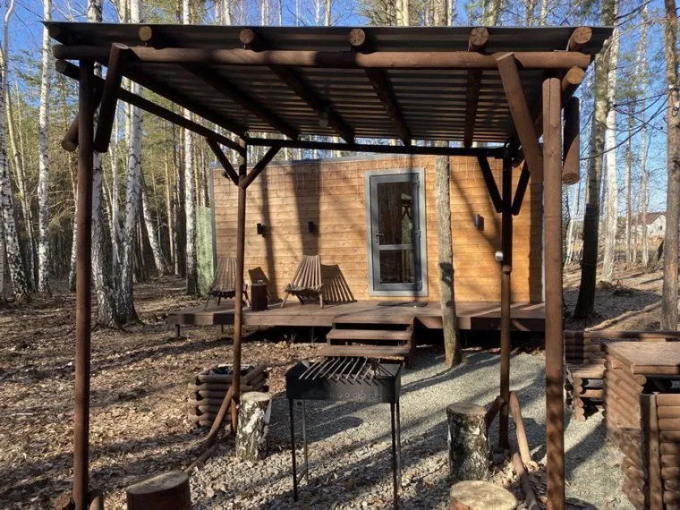 В нем посетителей ждут десять уютных домиков — девять дач на двоих и один сканди-дом для компаний на четыре человека. В каждом из них есть оборудованная кухня, санузел с душевой, двуспальные кровати, мангальная и обеденная зоны. Аренда домика на сутки начинается от 3900 рублей.
