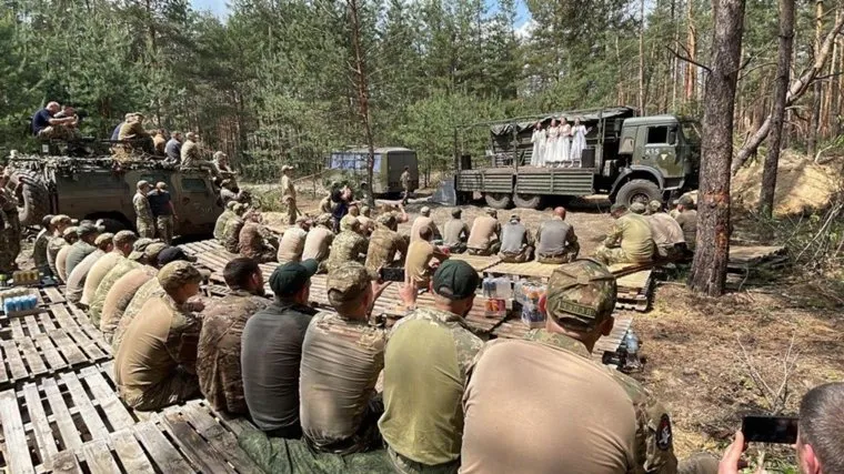В конце выступления девушки вместе с бойцами прочитали молитву «Отче наш». Кроме песен сотрудницы компании подготовили танцевальные номера — в национальных костюмах девушки исполнили русские народные танцы.