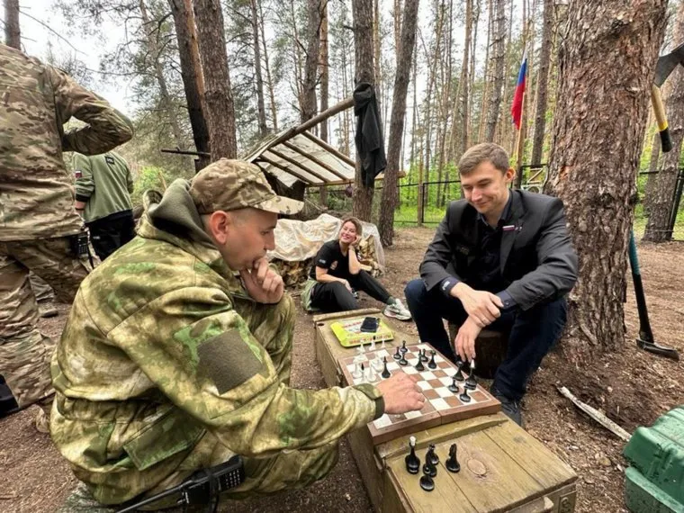 Вместе с сотрудницами «Сима-ленда» в Луганск слетал и российский гроссмейстер Сергей Карякин — на месте он не только пообщался с бойцами, но и сыграл с ними несколько шахматных партий.