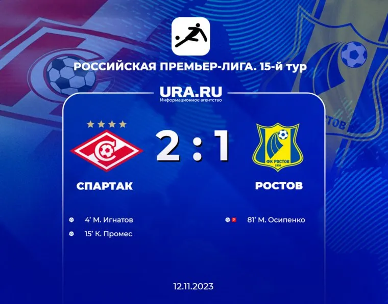 «Спартак» не выигрывал три матча подряд и снова появились разговоры об отставке главного тренера Гильермо Абаскаля. У испанца было свое видение на этот вопрос и решил он на него ответить первыми минутами в матче с «Ростовом». Красно-белые накинулись на ворота Сергея Песьякова и усилиями Михаила Игнатова, и Квинси Промеса смогли забить два гола за 15 минут. Сначала Промес отдал передачу в центр штрафной на Игнатова и тот пробил в противоход голкиперу. Затем Игнатов сделал пас в ту же зону, где был сам при забитом мяче, но сейчас там оказался Квинси. Голландец был точен. Ростовчане смогли ответить лишь забитым пенальти Максима Осипенко. «Спартак» создает плотность в верхней части таблицы.