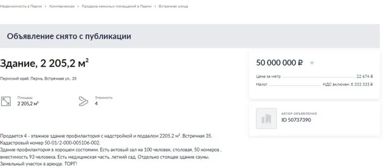 Здание санатория «Гармония» на ул. Встречной, 35 в Перми его владелица Екатерина Шубодерова пыталась почти год продать на сайтах недвижимости. Цена составляла 50 млн рублей. «Здание профилактория в хорошем состоянии. Есть актовый зал на 100 человек, столовая, 50 номеров, вместимость 93 человека. Есть медицинская часть, летний сад. Отдельно стоящее здание сауны. Земельный участок в аренде. ТОРГ!» — отмечалось в одном из объявлений.