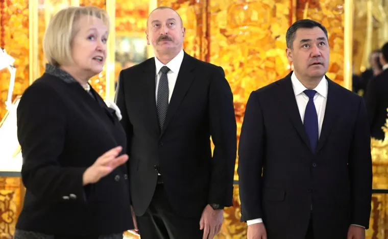 Янтарная комната Екатерининского дворца в Царском селе, очевидно, сильно впечатлила Ильхама Алиева (посередине) и Садыра Жапарова (справа)