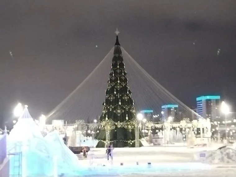 Постарались и власти в Чайковском, там на центральной площади красуется высокая елка с ярко-золотой звездой на верхушке. С верхней части вниз расходятся золотые гирлянды, по примеру пермской коллеги, а по всей длине самого сооружения повешены золотые звезды.