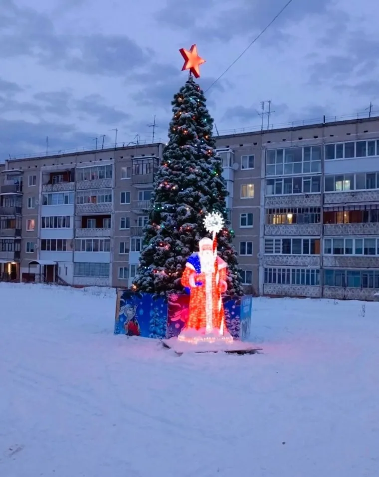 Симпатичную ель поставили в одном из дворов Березников. Там настоящее дерево украсили огромной красной пятиконечной звездой на верхушке, а внизу на охрану поставили Деда Мороза. Сам Дедушка подсвечен яркими огнями и держит в одной руке мешок с подарками, а в другой — посох.