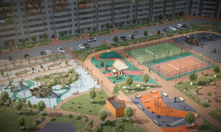Там застройщик взялся осваивать и наполнять активностями один из самых больших дворов Екатеринбурга — площадью почти 3 га. Для спортсменов предусмотрены два полноразмерных корта. Фактически это будет двор нового типа: зимой там будут доступны для жителей фигурное катание, хоккей и горки, летом — песочницы, качели, мини-скалодромы и столики для настольных игр.