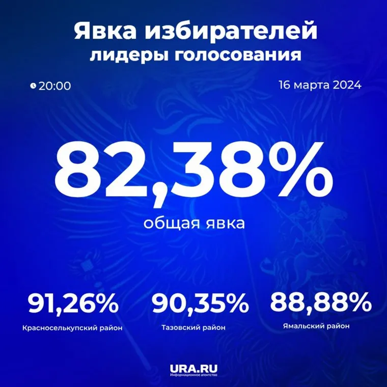 В ЯНАО завершился второй день голосования на выборах президента РФ. Явка в регионе к закрытию участков в 20:00 составила 82,38% — свои голоса за будущего главу государства отдали 309 111 ямальцев. Еще до старта голосования ямальский избирком прогнозировал явку в 86% — сегодняшние цифры позволяют рассчитывать на более высокие результаты.