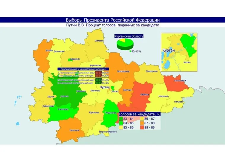 По данным портала ГАС «Выборы», в Частоозерском округе за Путина проголосовали 88,52%, в Половинском — 88,2%. Меньше всего основного кандидата поддерживали в Мишкинском (83,11%) и Шумихинском (83,52%) муниципальных округах. В целом за Путина проголосовали 85,63% жителей региона. Жители Кургана предпочли кандидата «Новых людей» Владислава Даванкова остальным оппозиционерам. На Западной ТИК он получил 4,47% голосов, а на Восточной — 4,89%, заняв в городе второе место. «Дело в том, что Даванков более популярен у городского населения. Поэтому и такие цифры», — пояснил URA.RU политолог Александр Безделов.