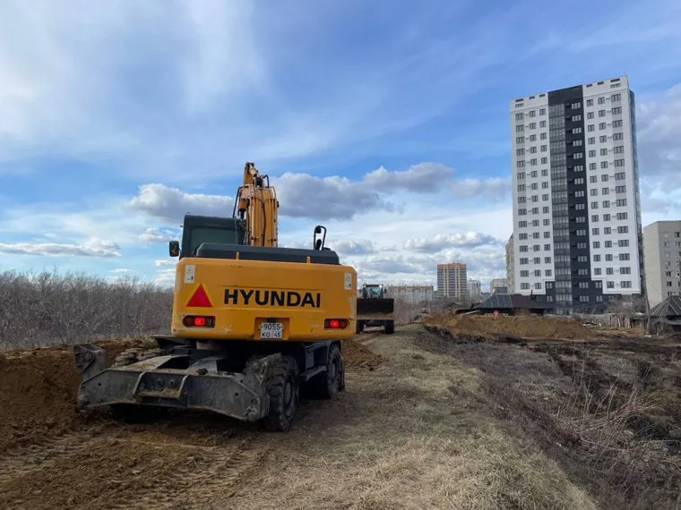 Спецтехника завозит тонны глины и трамбует дамбу, чтобы обезопасить многоэтажку от стихии