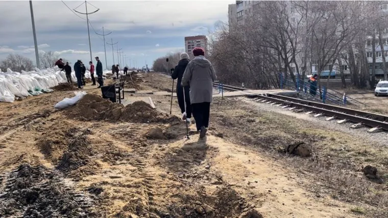 На набережной Кургана уже не так многолюдно. Повсюду грязь от глины, которой набивали мешки и укрепляли дамбу от наводнения. Однако многие продолжают приходить ради прогулки. Одни для того, чтобы подышать свежим воздухом, другие — посмотреть, как город защищают от потопа.