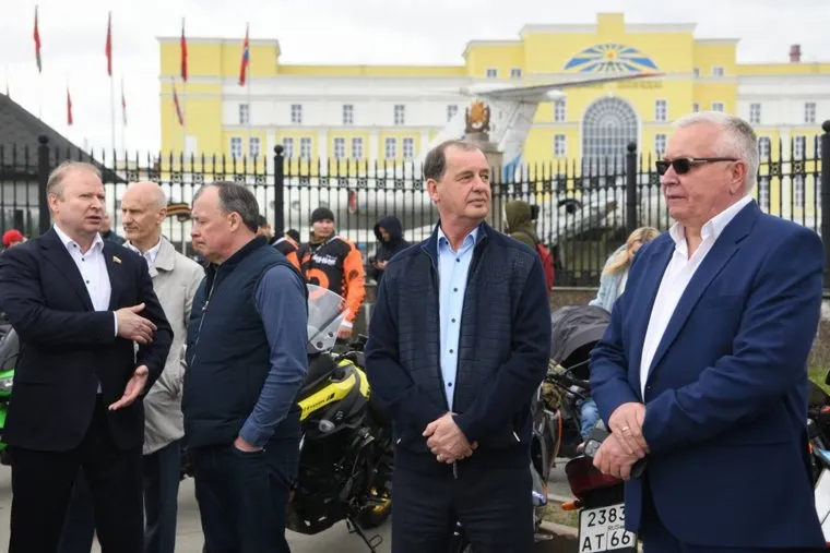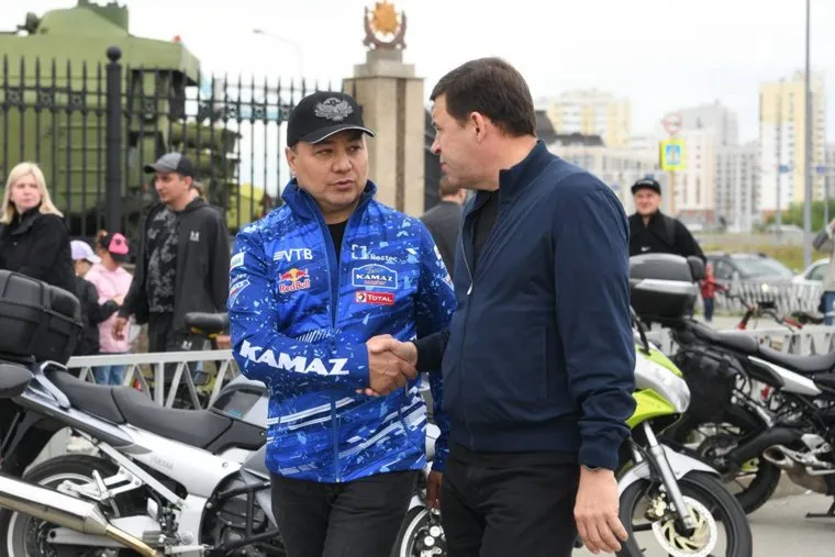 После официального старта колонна мотобайкеров отправилась в Екатеринбург. Следом — Куйвашев и Орлов. Но не на мотоциклах, а на машине. Сегодня они целый день проведут на площадках «Движения».
