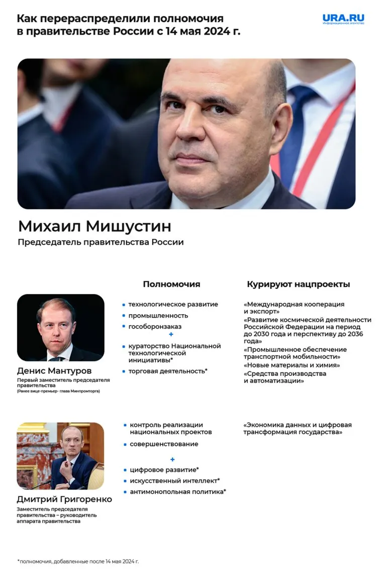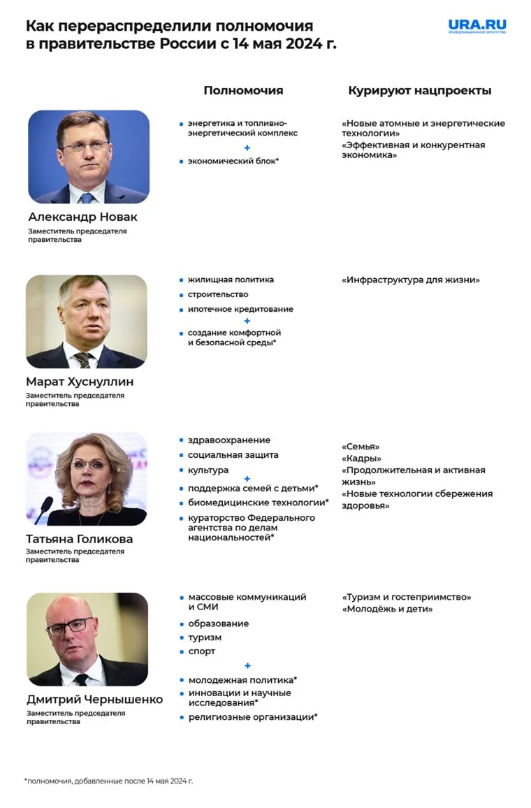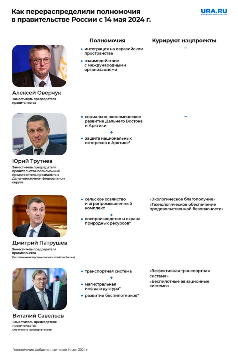 Заметные перемены произошли в перераспределении отраслей, которые курирует каждый вице-премьер. Во многом дополнительные обязанности перекликаются с задачами национальных проектов и госпрограмм. Расширение компетенций поможет опытным управленцам раскрыться в ключевых для экономики сферах и укрепить свои позиции, считают эксперты URA.RU.