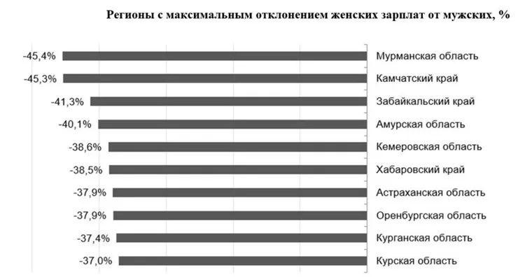 Согласно исследованию FinExpertiza, в 2023 году женщины, работающие на крупных и средних предприятиях, зарабатывали на 33% меньше мужчин, что составляет почти 28 тысяч рублей. Средняя зарплата женщин — 56,2 тысячи рублей. Наибольший гендерный разрыв наблюдается в северных и дальневосточных регионах России, таких как Мурманская область и Камчатский край, где женские зарплаты были ниже мужских на 45,4% и 45,3% соответственно.