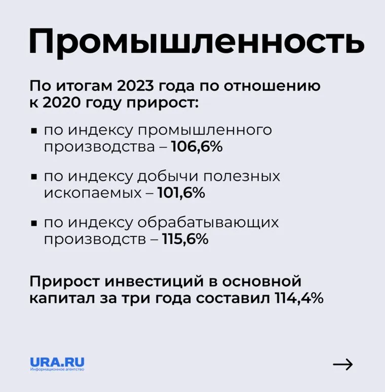 Несмотря на это, уже с 2021 года регионы УрФО начали восстановление. По итогам 2023 года по отношению к 2020 году фиксируется прирост по индексу промышленного производства (106,6%), по индексу добычи полезных ископаемых (101,6%), индексу обрабатывающих производств (115,6%).