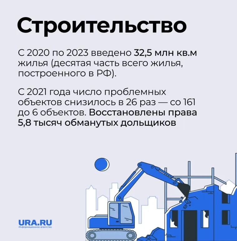 Якушев показал свою сильную сторону — строительство. При его губернаторства высокими темпами начала застраиваться сначала Тюменская область, а потом и весь Урал. В общей сложности с 2020 по 2023 год в УрФО введено 32,5 млн кв. м. жилья. Это десятая часть всего жилья, построенного в России за указанный период (строительство жилых домов в РФ с 2020 по 2023 год — 387,8 млн кв. м). Практически решилась проблема обманутых дольщиков. С 2021 года число проблемных объектов в УрФО снизилось в 26 раз — с 161 до 6 объектов. Восстановлены права 5,8 тыс. жителей, пострадавших от действий недобросовестных застройщиков.