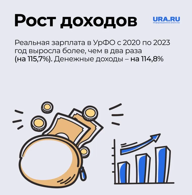Один из ключевых показателей работы чиновника — рост благосостояния жителей вверенной ему территории. В УрФО больше, чем в два раза выросла реальная заработная плата ( с 2020 по 2023 годы). Планомерно растет реальная заработная плата. (2023 к 2020 — 115,7%). Растут и реальные денежные доходы населения (114,8%). Увеличивается оборот розничной торговли. В 2020 году показатель составлял 2,8 трлн рублей, а уже в 2023 — 3,8 рублей, что больше на 110%. На 7,5% выросло количество субъектов малого и среднего предпринимательства, с 487,9 тысяч единиц в 2020 году до 524,4 тысяч единиц в 2023 году. Регионы федерального округа к 2020 году на 60% нарастили объёмы экспорта.