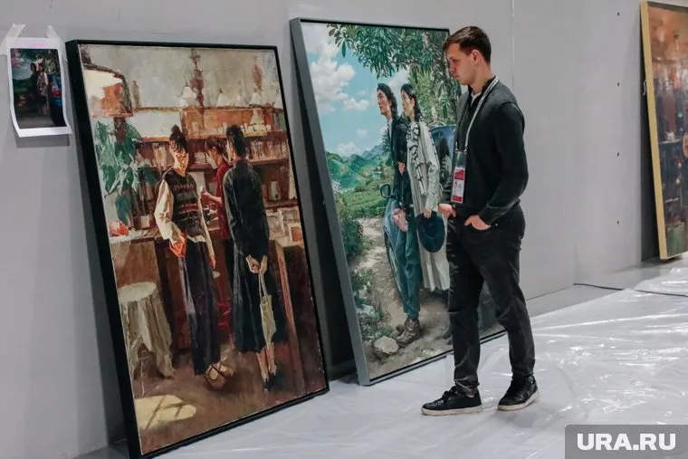На серых стенах кое-где уже повесили работы молодых художников из России, Китая, Индии, Бразилии, Эфиопии и Ирана: с их культурными кодами, представлениями о мире и человеке можно познакомиться, не выезжая за пределы Москвы. На месте некоторых пока висят распечатанные изображения, чтобы рабочие не запутались. Все же, в общей сложности на выставке будет представлено свыше 250 произведений, созданных молодыми творцами. Один из них — бразилец Рафаэль Бетеш. Он наблюдает, как работы его и его коллег занимают почетные места на серых стенах. Можно подумать, что из-за цвета все сливается в какое-то безрадостное пятно. Как отмечает куратор выставки, ректор Санкт-Петербургской академии художеств имени Ильи Репина Семен Михайловский, это было сделано, чтобы акцентировать внимание на картинах.