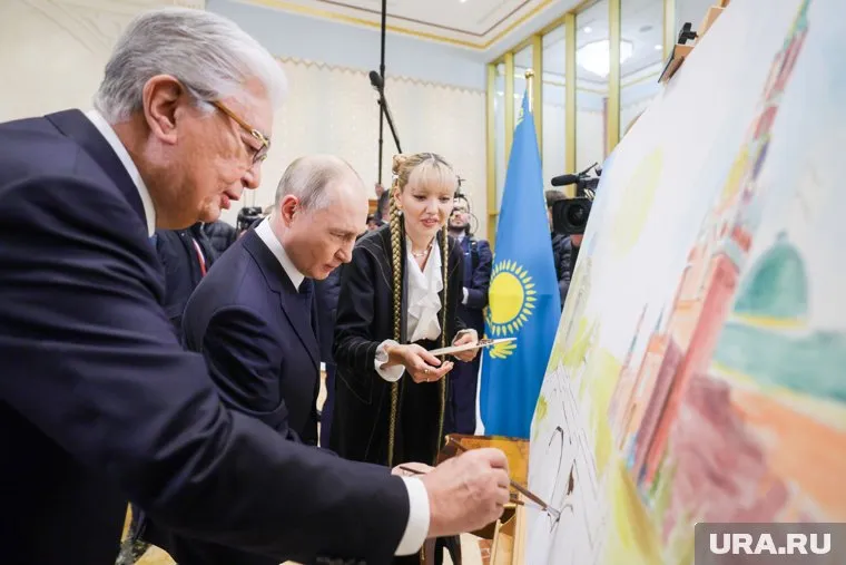 Президенты приложили руки к картине об отношениях России и Казахстана, которую пишет местная художница Асель Сабыржанкызы. Путин и Токаев взяли кисточки и немного помогли раскрасить мост дружбы, символично соединяющий две резиденции — Акорду и Кремль. «Идеально», — оценила мастер работу лидеров. Полотно Путин уже завтра увезет в Москву.