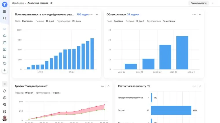 Кроме того, «Трекер» позволит отказаться от постоянных отчетов, которые не только занимают много времени, но и часто являются недостаточно наглядными и только усложняют контролирование задач. Вместо этого руководитель отдела маркетинга может воспользоваться дашбордами, которые позволяют отслеживать все важные показатели на одной странице.