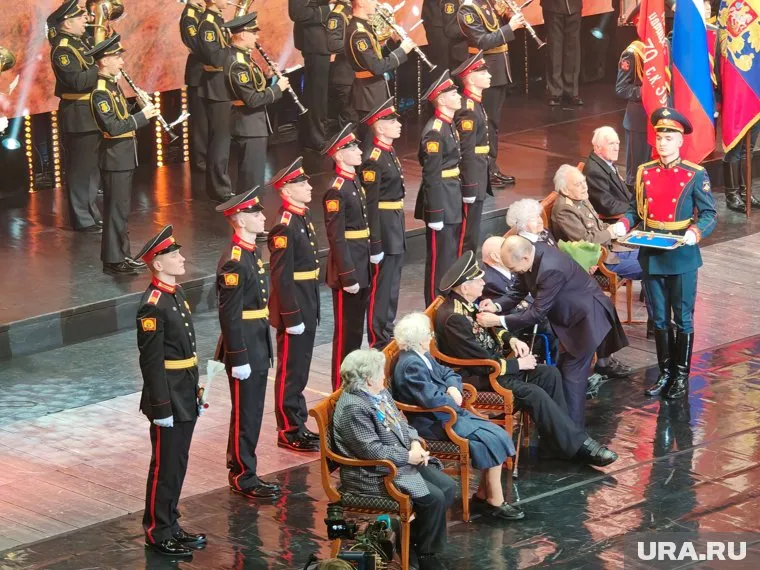 Но вот всех позвали в зал. Вновь зазвучали любимые мелодии в исполнении военного оркестра. На сцену вынесли знамя Победы, Флаг России, президентский штандарт и флаг Санкт-Петербурга, а также — Золотую Звезду, которую Ленинград получил в 1965 году и стал одним из первых Городов-героев. После объявления ведущего кадеты стали выводить на сцену защитников Ленинграда — семь человек, четверо из которых уже отметили 100-летние юбилеи. Зал приветствовал их стоя. Именно им, семи ветеранам, президент Путин чуть позже вручил первые юбилейные медали «80 лет Победы в Великой Отечественной войне 1941–1945 гг.».