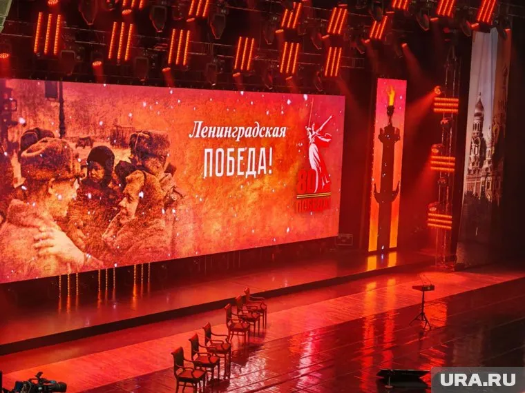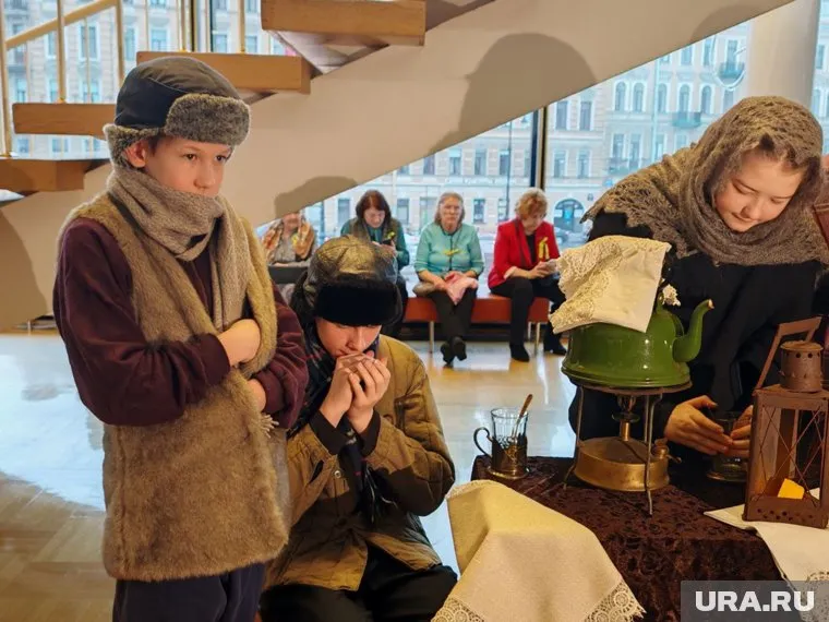 А тем временем в Большом концертном зале «Октябрьский» уже собирались ветераны Великой Отечественной, блокадники, труженики тыла. Среди них мелькало много молодых и совсем юных лиц: курсанты и кадеты, юнармейцы. Здесь же, конечно, участники СВО. В фойе — несколько локаций, инсценирующих блокадные дни: вот учитель занимается детьми, вот — семья пытается согреться от слабого огня керосинки, им приносят письмо с фронта, сын начинает читать.