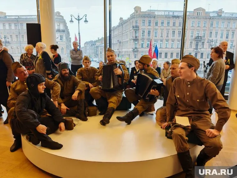 Но больше всего зрителей собрала группа солдат на привале, которые под гармошку поют песни военных лет. «Город над вольной Невой! — затянули бойцы, и тут же зазвучал уже целый хор — зрители вмиг подхватили Гимн Ленинграда, — Город нашей славы трудовой! Слушай, Ленинград, я тебе спою задушевную песню свою». И это была действительно задушевная песня, наполненная бесконечной любовью к родному городу.