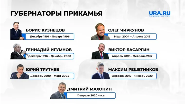 В новейшей истории Прикамья в 90-е годы первые губернаторы области работали, в среднем, по четыре года. Борис Кузнецов уступил кресло Геннадию Игумнову, а Игумнов в 2000-м году проиграл выборы экс-мэру Перми Юрию Трутневу. Трутнев на посту главы региона создал прецедент объединения двух субъектов Федерации (Коми-округа и Пермской области), в результате чего в качество своеобразной премии получил назначение в правительство РФ министром природных ресурсов. В последние годы Трутнев занимает пост вице-премьера и является одним из самых влиятельных политиков в РФ.