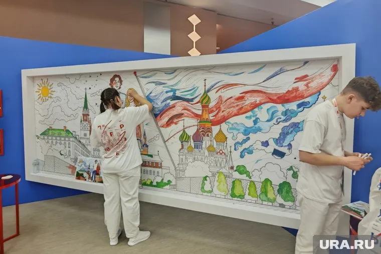 Каждый из ребят и взрослых, с кем мы познакомились на съезде, на вопрос о том, чем они занимаются и что их привлекает в Движении, отвечали одинаково: на первом месте патриотика. В кулуарах съезда с любовью к Родине, к семье, к традициям связаны все активности: одни участники раскрашивают огромную картину с изображением юноши и девушки на фоне российского триколора и Красной площади, другие готовятся к параду Победы — на мастер-классе собирают из Георгиевской ленточки красивые значки.