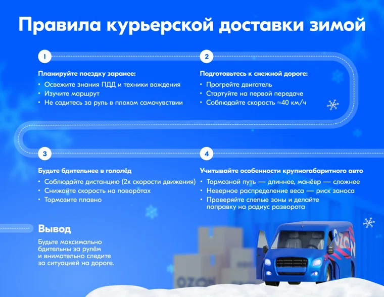 К концу осени дороги превращаются в настоящую полосу препятствий. Короткий световой день, осадки и гололед требуют особого внимания каждого водителя. А для курьеров, чья работа — скорость и пунктуальность, грамотное поведение на проезжей части становится основой безопасности, в том числе и других участников движения. В преддверии сезона высокой аварийности руководитель направления безопасности дорожного движения Ozon Евгений Лагерной рассказал URA.RU, как сделать каждый выезд на маршрут безопасным.