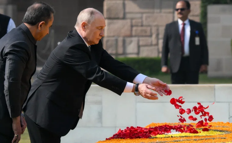 На некоторое время они расстались: Путин отправился на мемориал Махатмы Ганди, одного из идеологов движения независимости Индии от Британии. Здесь, на мемориальном комплексе «Раджгхат», одном из священных мест, ходить принято без обуви. Перед тем, как покинуть комплекс, Путин написал в книге почетных гостей: «Один из основателей современного индийского государства, великий философ и гуманист — Махатма Ганди внес неоценимый вклад в дело мира на всей планете. Его идеи о свободе, добродетели и человеколюбии — не теряют актуальности и по сей день. Махатма Ганди, по сути, предвосхитил тот новый, более справедливый многополярный миропорядок, который сейчас находится в стадии формирования».