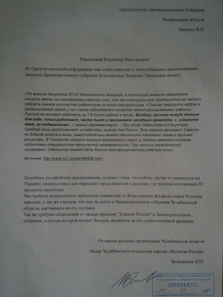 «Подобные русофобские высказывания, схожие с теми, что сейчас звучат от радикалов на Украине, недопустимы для народного представителя в регионе, где русские составляют 83 процента населения. Мы требуем немедленных извинений от Константина Захарова перед русским народом, а также считаем, что ему не место в Законодательном собрании Челябинской области, настаиваем на его отставке. Также требуем объяснений от лидера фракции „Единой России“ в Законодательном собрании, в состав которой входит Захаров, являются ли его слова позицией фракции», — заявил Большаков в письме на имя спикера Заксобрания Владимира Мякуша. Самому же Захарову лидер «Великой России» порекомендовал переехать на постоянное место жительства в Узбекистан.