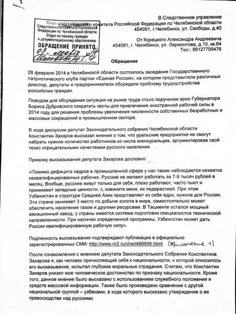 Добавим, что сегодня заявление в региональное СУ Следственного комитета по этому же поводу подал челябинский общественный активист Александр Корецкий. По его мнению, процитированные заявления являются ксенофобскими, поэтому депутат должен понести наказание по ст. 282 УК РФ («Возбуждение национальной, расовой или религиозной вражды»).