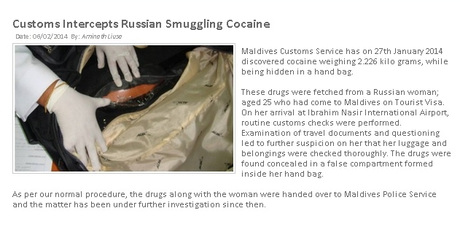 Прилетев в международный аэропорт им. Ибрагима Насира, 25-летняя стилист-визажист из Челябинска успела только разместить на своей страничке «Вконтакте» сообщение «Я на мальдивах. Все гуд))». Как выяснилось, девушка поторопилась. На таможне она по какой-то причине вызвала к себе подозрение, ее допросили и обыскали багаж. В скрытой полости сумки, по утверждению таможенной службы Мальдив, было обнаружено 2 кг 226 граммов кокаина.