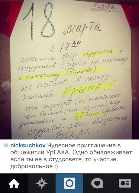 До митинга в поддержку итогов референдума в Крыму остаются считанные часы. «URA.Ru» стал известен один из фактов планируемого подвоза. Руководство УралГАХА обязало некоторых студентов явиться в 18.00 на площадь Труда. Объявление об этом, размещенное в общежитии академии, появилось сегодня в Интернете. «В 17.40 состоится сбор студентов и сотрудников (идем к памятнику Татищева) на митинг в пользу жителей Крыма!!! Кто подойдет (а желательно чем больше, тем лучше) всех записываю и 1,5 часа отработки. Студсовет — явка обязательна всем», — гласит бумага.