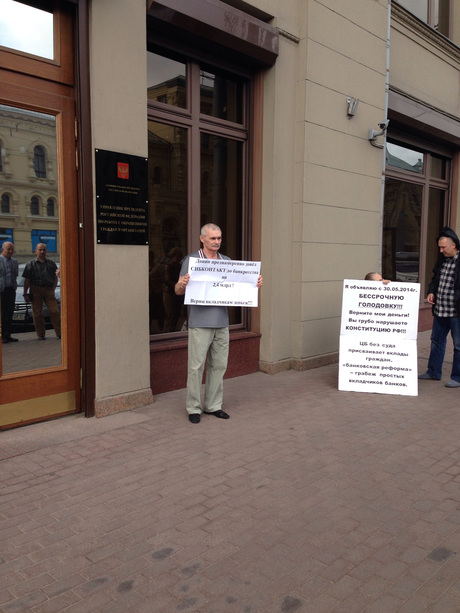 «Присоединились представители еще нескольких российских банков, вкладчиков „Сибконтакта“ пока шесть человек. Мы в порядке. А вот Татьяна, которая потеряла деньги из-за Мастер-Банка, в очень плохом состоянии — без еды с 30 мая. Вставать уже не может», — говорит один из участников акции протеста. Он добавляет, что к митингующим сегодня долго никто не выходил, потом подошли полицейские и запретили собираться, вести фото- и видеосъемку.