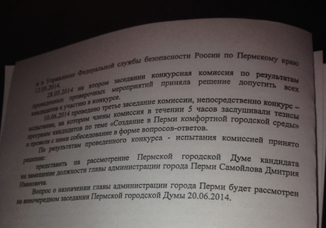 Заксобрание Пермского края удовлетворило требование депутата Дмитрия Скриванова и предоставило ему ранее нигде не опубликованную информацию о работе конкурсной комиссии. Как передает корреспондент «URA.Ru», утреннюю просьбу парламентария удовлетворили лишь под занавес пленарного заседания. Поскольку господин Скриванов просил предоставить информацию «о работе», то к делу подошли предельно формально, рассказав ему, чем комиссия занималась с момента своего создания до проверки всех кандидатов в ФСБ и полиции заканчивая собеседованием 10 июня. На нем, как говорится в бумаге, в течение 5 часов заслушивали тезисы программы «Создание в Перми комфортной городской среды» каждого из соискателей, после чего задавали и вопросы и получали ответы.