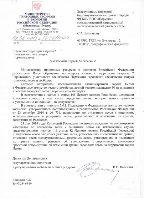 23 мая Комиссия Россельхоза рассмотрела материалы, представленные администрацией города Перми, и приняла решение об утверждении отрицательного заключения проектной документации об изменении границ Черняевского леса. Кроме того, в своем письме чиновник указывает на то, что изменение границ городского леса недопустимо в соответствии с ч. 6 ст. 105 Лесного кодекса РФ.