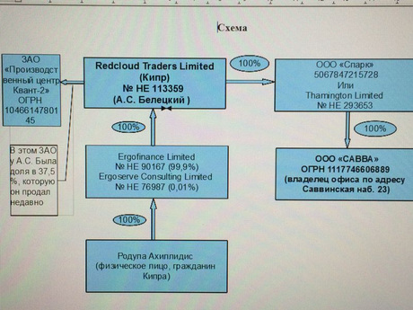 Следствие по уголовному делу о ведении незаконной аудио- и видеофиксации в московском офисе «Корпорации Развития» пришло к неожиданным выводам. На самом деле, компания въехала в этот офис не случайно: по данным источников в правоохранительных органах, скорее всего, он принадлежит бывшему гендиректору «Корпорации Развития» Александру Белецкому через кипрский офшор Redcloud Traders Limited. Этой же компании принадлежит дом на Рублевском шоссе в Москве, в котором проживает Белецкий. Есть пока неподтвержденная версия, что этому же юридическому лицу может принадлежит венгерская недвижимость, где постоянно проживает семья Белецкого.