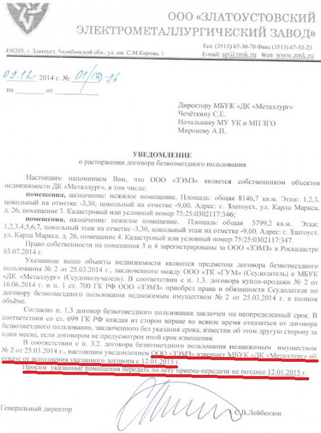 Директор ДК «Металлург» Сергей Чечеткин получил уведомление от гендиректора Златоустовского электрометаллургического завода (ЗЭМЗ) о расторжении договора безвозмездной аренды здания. Как говорится в документе, детские кружки и секции должны освободить помещения до 12 января — передает корреспондент «URA.Ru».