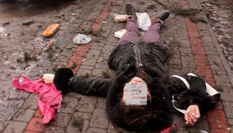 В микроблоге журналиста — жуткие кадры с места происшествия, на одном из них девушка с разорванным взрывом лицом, у ног которой несколько буханок хлеба — часть той гуманитарной помощи, дожидаясь которой люди простились с жизнью.