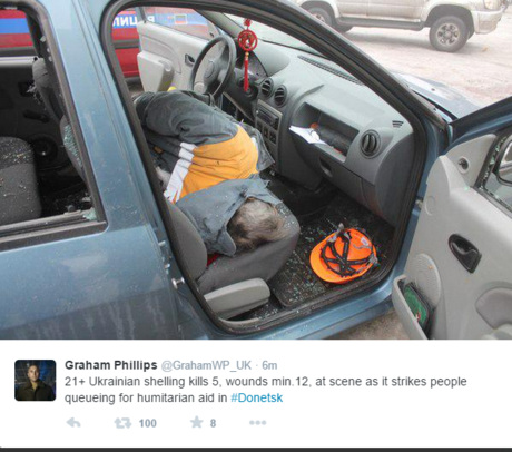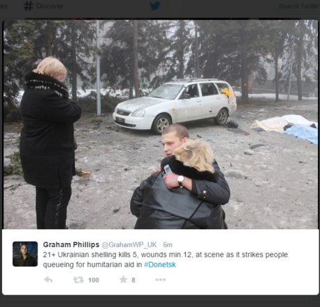 Под обстрелом в Куйбышевском районе Донецка, по разным данным, погибло от пяти до 12 человек. Как пишет в своем Twitter британский журналист Грэм Филлипс, который в настоящее время находится на Украине, снаряды попали в людей, когда те ждали выдачи гуманитарной помощи.