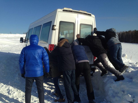 Журналисты находятся в поле около получаса. Микроавтобус хорошо отапливается, поэтому риска для их здоровья нет.