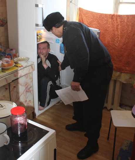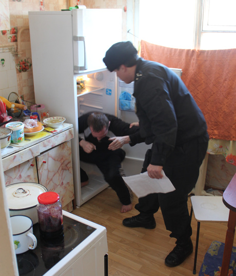 «В ходе исполнительных действий удалось узнать, что Эдуард Г. проживает в квартире по адресу ул.Техническая, 53 со своей матерью. Войдя в помещение, приставы обнаружили, что в однокомнатной квартире нет никого, кроме хозяйки жилища. С нее было решено взять объяснения и составить протокол по ст.17.8 Кодекса об административных правонарушениях о воспрепятствовании законной деятельности судебного пристава. В это время из стоящего на кухне холодильника показалась рука. Открыв дверцу, приставы обнаружили, что в холодильнике, свернувшись калачиком, сидит Эдуард», — рассказали «URA.Ru» в пресс-службе УФССП.